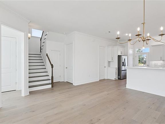 Open floor planSamsung stainless steel appliancesWhite shaker cabinetsGold fixturesWhite vinyl windowsAbundance of natural light