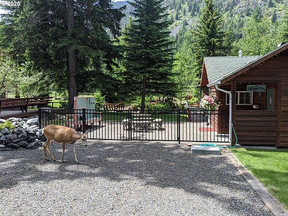 Enjoy the sounds of the river, sit back and relax in this vacation home at Wallowa Lake, Oregon. This beautifully maintained, updated 2 bedroom, 1 1/2 bath home on .43 landscaped acre is a short walk to the lake, state park, and activities, but on a quiet street. It has a water feature and spring fed pond, large deck and patio. The living and dining area where you spend most of your time is large and gracious with a fireplace, many windows looking out at the view, and glass door access to deck.