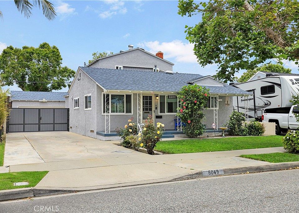 Tree-lined street in Lakewood's Mayfair neighborhood! Nestled mid-block is this lovely home with an inviting front yard and cozy, peaceful porch that faces east - perfect place to relax after a long day. Classic style with upgrades throughout! Enter to find beautiful hardwood flooring in the living room spacious enough for an L Shaped couch and sitting area. Two main floor bedrooms share a recently renovated full bathroom and hall linen cabinetry. Remodeled entertainer's kitchen with tile flooring, kitchen island with butcher block, grey cabinetry with granite counters and tile backsplash. Walk in pantry! Stainless steel appliances. Dining area open to kitchen and den with gas fireplace and french doors to backyard. Laundry, conveniently located on the main floor. Beautiful primary suite provides an upstairs oasis - the primary suite includes high windows that let in natural light, wood flooring, walk in closet and full bathroom plus a lovely private deck -- and spacious deck perfect to watch sunsets! CENTRAL HVAC system. NEWER ROOF! DOG RUN! Huge bonus is the long driveway that both provides parking for multiple vehicles/toys plus leads to a detached garage/workshop. NEWER AUTOMATIC DRIVEWAY GATE - convenient! Privacy abounds in the backyard, patio perfect for entertaining plus garden area. BONUS: free standing sunroom - great office/flex space/home gym/possible conversion by next owner to an ADU! Convenient location just minutes away from parks, restaurants and shopping plus access to freeways!