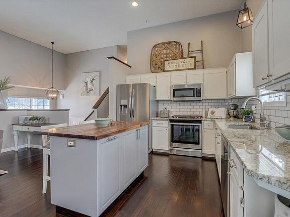 Gorgeous move-in ready three level split home situated in a quiet Farmington neighborhood. Wonderful floor plan with an open concept main level, ideal for entertaining! Expansive 12-foot ceilings create a luxurious environment. Spacious main level presents an updated kitchen with granite countertops, center island and tons of storage. Adjoining dining with access to the deck! Main level family room is generously sized and offers tons of natural light through the oversized windows. Upper level Primary Bedroom is roomy with a walk-in closet and a large walk-through bathroom + a private deck. Reclaimed wood plank accent wall & barn door. 2 more bedrooms are situated on the upper level, both with great closet space! The lower level has a cozy family room, a laundry/3/4 bathroom. 2022 Fully fenced backyard, full sized storage shed, a 3rd deck on the ground level. Close to restaurants, retail, just steps away from great walking trails at Prairie View Park, plus even more!