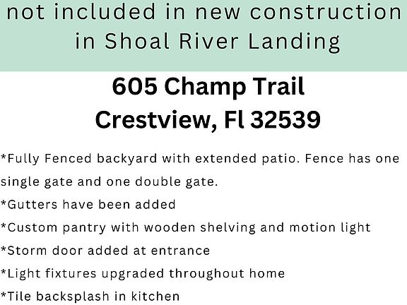 This 4/3 is located on a corner lot in a pool community, offers a quick commute to Eglin AFB/7SFG and has a ton of upgrades! This home has a VA ASSUMABLE loan with a 2.875% Interest Rate! As you step inside you will be amazed at the kitchen that offers a granite island, plenty of cabinet space, stainless steel appliances, and a custom pantry. The kitchen is also open to the living and dining areas, creating a perfect space for entertaining. From the living room, enjoy views of your fully fenced backyard with extended patio! Each of the bedrooms is generously sized, offering comfort and versatility for your family or guests. The primary en suite features a garden tub, stand-up shower, double vanity, walk-in closet, and a private water closet Be sure to check out the photos for a list of all of the additional upgrades in this home!
