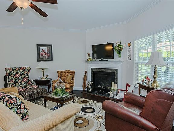 This well-maintained home on a cul-de-sac lot offers an open floor plan spanning approximately 1,945 SF w/3 Bdrms & 2 Bath. There is a seamless flow throughout the main living area offering a large Great room, formal dining, breakfast room & a well-equipped kitchen with a large pantry, under-cabinet lighting, granite countertops, & ample cabinet space. All Appliances remain (not warranted). The home is adorned with a cozy gas-log fireplace, crown molding, storm doors & vinyl tilt windows with plantation blinds. Washer/Dryer remain (not warranted). The (24x22.4) garage includes a storage room and pull-down stairs for additional storage space. The primary bedroom features an ensuite bath w/walk-in shower & a large WIC. The heating system is serviced bi-annually by Webb H&A, ensuring comfort & efficiency. The exterior is just as impressive, with a well-manicured lawn and patio surrounded with lush greenery & colorful plants providing a peaceful setting.