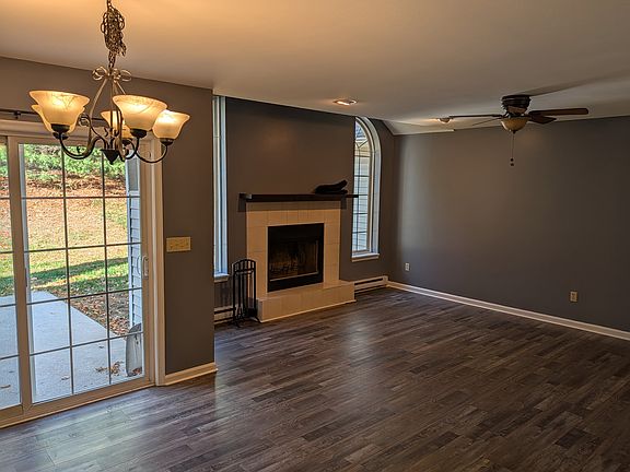 Wood-burning fireplacePrivate patioColonial-style townhomeOpen-concept layoutLarge windowsVinyl flooringGranite countertops