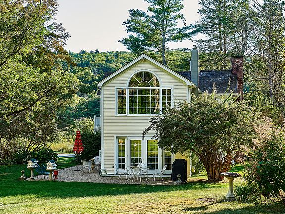 This historic home was constructed by Thomas Bishop, a veteran of the War of 1812 in the early 1800's and was once known as Bishop's Tavern. It began as an inn and tavern on what was once, the Stockbridge and Hudson stagecoach line. Since then it has been lovingly tended and updated with an eye to preservation. Located on a quiet country road in Red Rock and surrounded by mature gardens and stately trees this property has much to offer. The front of the house has access to two covered porches, one on each floor that offer seating and views of the pasture and hill beyond. Entering the home from the side, this open porch entry brings you into a large parlor that stretches across the length of the main house. A newly built fireplace is flanked by floor to ceiling windows giving light to the original ceiling beams and wide board flooring. A full bath and pantry are set off this room. To the rear of the house is a combination kitchen and sitting room with access to the wrap around stone terrace through two sets of French doors. This room is a light and airy space with its generous windows and a propane stove for winter warmth. On the second floor there are three comfortable bedrooms; one with a working fireplace, one with a Juliette balcony and culminating in the main bedroom with a vaulted ceiling and a Palladian window overlooking the gardens and the two story barn/garage. The house and barn are set on one acre of land with a half acre parcel and a small pond across the road for view protection. More land available across the street of six acres Listing # 20254357. Queechy lake rights for swimming, boating and ice fishing just up the road. Come step into history and become part of the story of this unique property.