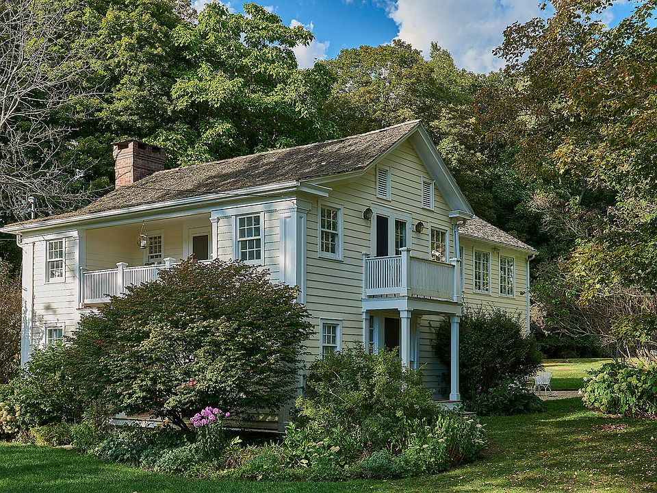 Floor to ceiling windowsSmall pondWorking fireplaceCovered porchesJuliette balconyOpen porch entryOriginal ceiling beams