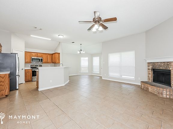 Step into the open living area where tile flooring flows across a spacious room anchored by a charming brick hearth. The kitchen is equipped with stainless steel appliances, plenty of counter space, and a bar that opens into the dining area, making it perfect for everyday meals and gatherings. The primary suite includes a generous walk-in closet, dual sinks, and a separate tub and shower for added comfort.