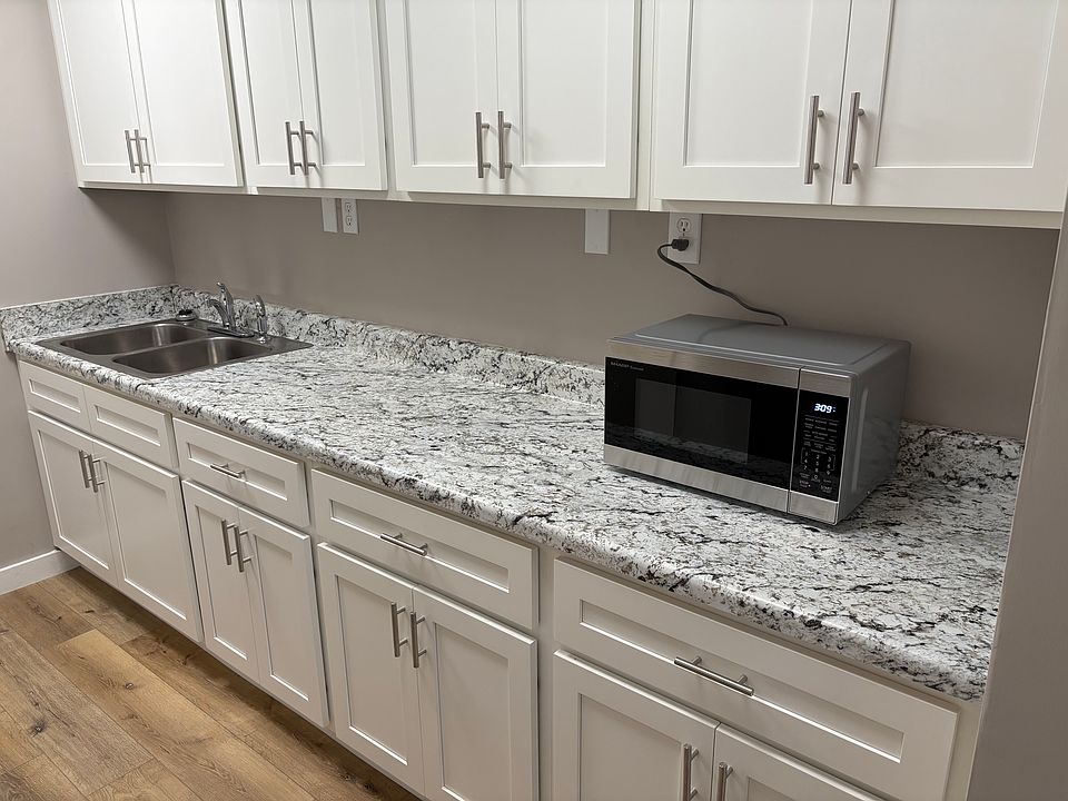 Remodeled bathroomNew flooringBeautiful kitchen cabinets