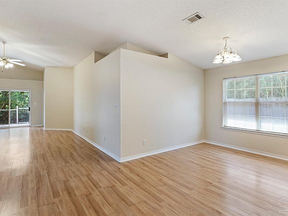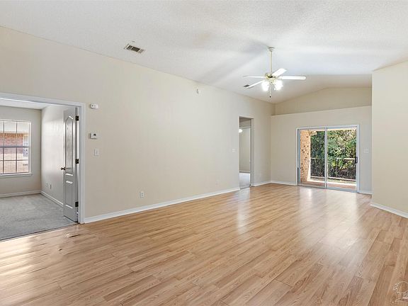 This contemporary 4-bedroom, 2-bathroom home is located in the Estates at Emerald Shores in southwest Pensacola, just minutes from the back gate of NAS. Offering over 1,900 square feet of living space, the home features a spacious living room with vaulted ceilings, wood-look laminate flooring, plant ledges, and a sliding glass door leading to a covered back porch. The kitchen offers abundant cabinet and counter space, an electric stove, refrigerator, dishwasher, and a cozy breakfast nook, while a formal dining room provides additional space for entertaining. The primary suite includes laminate flooring, a ceiling fan, and a private ensuite bathroom with a double vanity, garden tub, separate shower, and large walk-in closet. Three additional bedrooms are carpeted with generous closet space and share a full bathroom. A fully fenced backyard and a 2-car garage complete this move-in-ready home in a well-established neighborhood with no HOA dues.