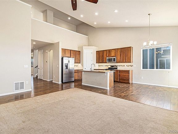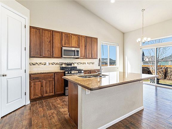 Absolutely stunning and rarely available, two story Craftsman style home with a highly sought after main floor master suite, in the coveted Sharpe Farms community of Dacono, Colorado. This amazing home is perfectly located on an over-sized park-like setting, backing to a greenbelt area with mountain views, loaded with fine features and quality upgrades, and has a FULL BASEMENT. You will love the true open concept floor plan with a soaring vaulted ceiling, extended wide-plank LVP wood grained laminate floors and a dramatic second story over look. The spacious floor plan is flooded with natural light through the large windows. The nicely appointed eat-in kitchen is a chef's dream with gorgeous Granite counters, upgraded cabinets, custom tile back-splash, stainless steel appliances, large walk-in pantry and more! The perfectly situated family room offers plenty of space for the whole family and offers a cozy tile faced gas fireplace with a custom wood mantle, and easy access to the outdoor living area. The luxurious main floor master suite is beautiful. This relaxful space offers a full 5 piece en suite with double vanity, large soaking tub, shower enclosure and huge walk-in closet. The main floor is complete with a private office / flex room, convenient laundry area with included Washer & Dryer. The upper level features a huge open loft area that is perfect for an in-home office, two large bedrooms, kid's homework nook, and a full bathroom. The full open basement is ready for your custom finishes or perfect for your storage needs. This incredible home perfectly sits on an over-sized park-like setting with a professionally landscaped yard and overlooks the community greenbelt area from the extended cement patio. Other features include an inviting covered front porch, full 2 car garage, central air, and so much more. Sharpe Farms has something for everyone. Enjoy community park, easy access to I-25 for an easy commute to Denver or Ft. Collins, and close to everything!