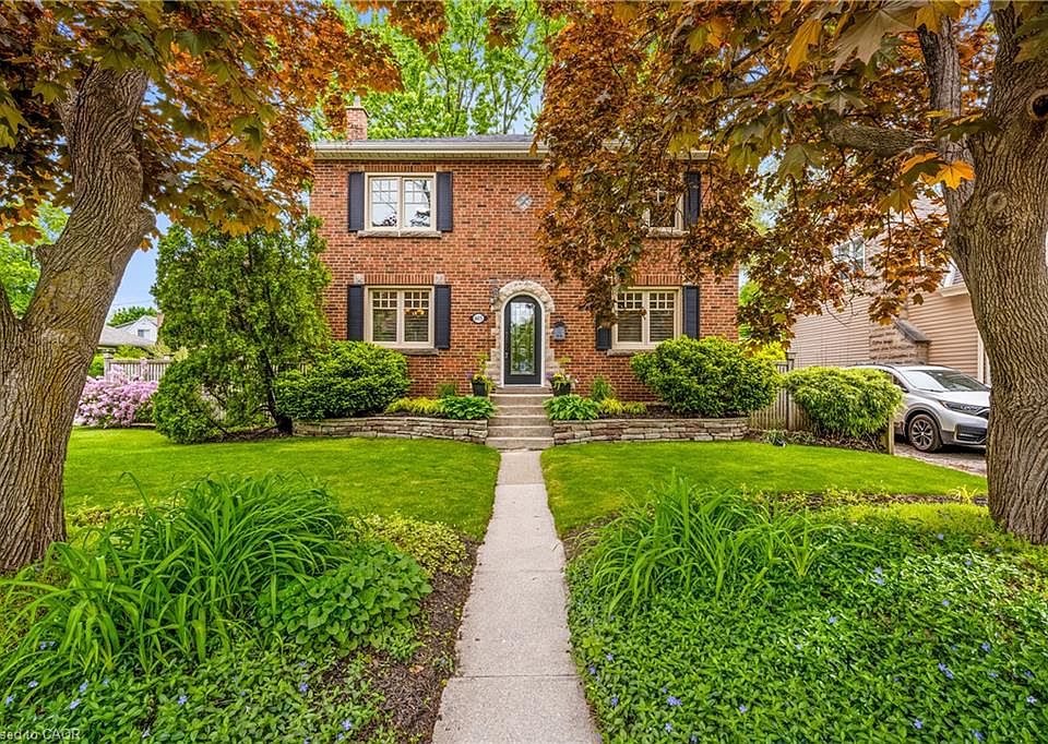 Step into timeless elegance with this beautifully maintained Georgian style home in the heart of downtown Burlington. Featuring a striking red brick facade, classic black shutters, and a stately arched stone entryway, this home exudes charm and curb appeal. Nestled beneath mature trees and surrounded by lush perennial gardens, it offers the perfect blend of historical character and modern comfort. Inside, enjoy a large living room, eat-in kitchen, and a convenient 2-pc bath. Upstairs boasts a spacious primary bedroom with two closets and a cozy nook ideal for a home office or reading space, plus two more generous bedrooms and a 4-pc bath. The finished basement offers a rec room perfect for entertaining or kids' play. Step outside to a private, fully fenced backyard, ideal for pets, play, or your morning coffee. Walk to the lake, shops, restaurants, schools, and transit. Close to major highways. A rare opportunity in one of Burlington’s most sought-after locations!