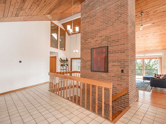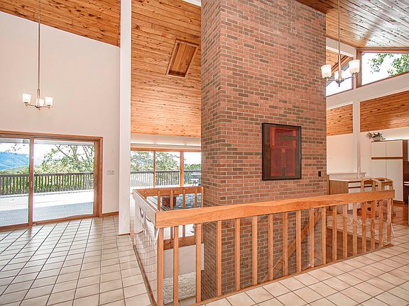 Contemporary 4-bedroom, 3-bath home with stunning views in Blacksburg. Open layout features hardwood floors, vaulted ceilings, and large windows. Kitchen includes an island overlooking a spacious family and dining area. Generously sized bedrooms include a primary suite with private loft. Main living area offers a floor-to-ceiling brick fireplace. Lower level includes an additional family room. Expansive deck provides outdoor living space. Two-car garage adds convenience and storage.