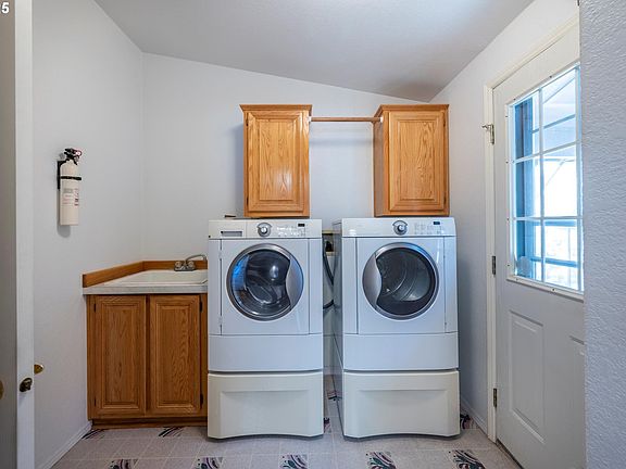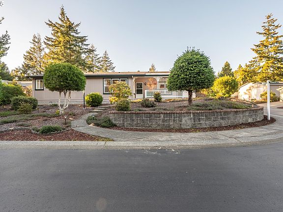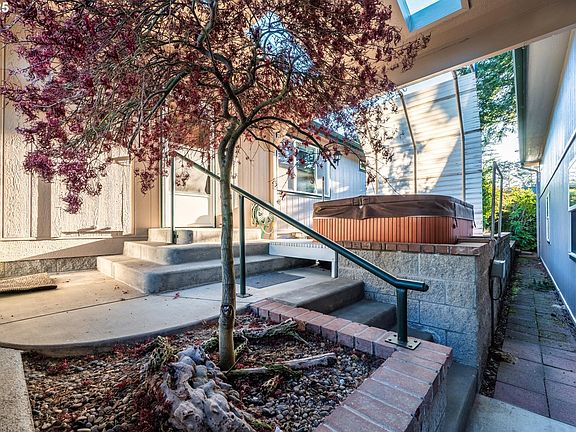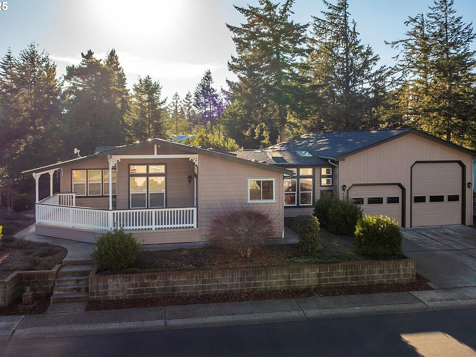 Enter through the expansive covered front porch, ideally placed on this East/South facing corner lot to capture the morning sunlight. Inside, this Golden West triple-wide home greets you with an open and inviting floor plan. The spacious layout features 2 bedrooms, a den with double doors, and 2.5 baths, with the second bedroom conveniently connected to the Jack-and-Jill bath. The bright and functional kitchen is a highlight, offering an eat bar, built-in oven and microwave, pantry, skylight, and a cozy nook with a slider leading to the covered deck—perfect for morning coffee or evening gatherings. Moving outside, the property boasts a low-maintenance yard with brick walkways surrounding the home and garage, and a concrete patio featuring a covered hot tub for ultimate relaxation. The 27' x 52' RV garage is a dream for adventurers, with a 12' tall RV door, RV dumpsite, 110amp power, and water hookup, offering plenty of space for your RV, trailers, and outdoor toys. This home offers a seamless blend of indoor comfort and outdoor functionality, making it an exceptional find!