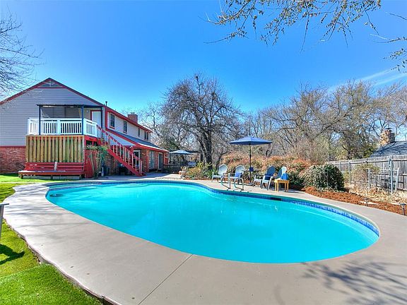 Beautiful 4-bedroom home on an oversized lot. This home sits on a cul de sac w/lots of trees & a concrete pool. Updated Hardy board siding. Two car garage w/a covered space for extra parking. Brick pavers as you enter the home w/a nice coat closet. Enjoy the spacious formal living room for family gatherings that leads into a formal dining space. Wood flooring & large windows give lots of natural light. The kitchen has been updated w/tile floors, updated backsplash & quartz countertops. The kitchen features stainless steel appliances, lots of storage, a desk, and a quartz topped island for barstool seating. The huge window gives lots of light. The living room is off the kitchen w/French doors to the patio, wood floors, a gas fireplace & built in bookshelves. Off the huge living space is a wet bar w/a sink & storage under the stairs, and a powder bath for guests. The laundry room is off the living space w/storage & access to the 2-car garage. The primary bed has wood floors, w/a large walk-in closet. Updated primary bath 2 w/tile floors & a quartz topped vanity, w/a shower/tub combo & barn doors. Off the primary bed is a darling covered patio that has exterior stairs that take you to the backyard. The other 3 beds all have great closets & wood floors. Upstairs bath has double sinks w/shower/tub combo. The backyard has a pool that is currently covered but has been updated. This includes new Gunite & new concrete decking last summer. Incudes a programmable pool pump and robotic pool cleaner. Two patios for entertaining and one is covered with a pergola. Extra covered storage on back of home that backs to garage. Huge, fenced backyard. Neighborhood has a community pool, park and ponds. Very closes to schools, restaurants and shopping.