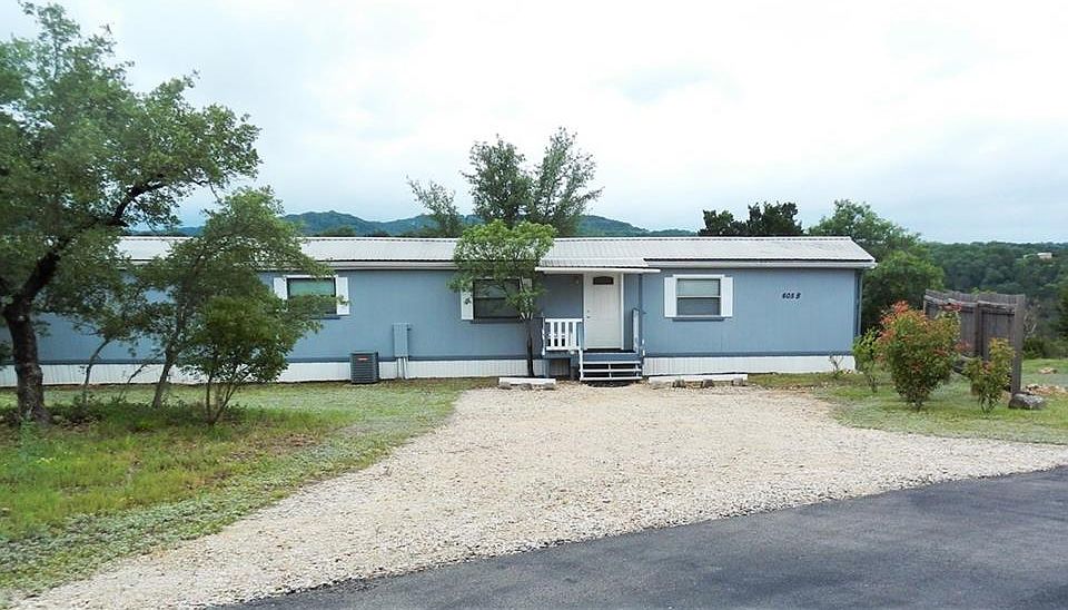 Very clean single wide mobile home; 2 bedrooms, 2 full bathrooms and an office. Kitchen with breakfast area and great Hill country views. Separate laundry room, washer and dryer are available to be used by tenant. Front porch and back porch. Shared driveway with 605 Kothmann Rd, parking available for 2 cars. Water supply from rainwater collection; first 3,000 gallon are free of charge every month, every additional 1,000 gallon $ 100. Texas data internet available.ONLY small Pet, no fenced yard.