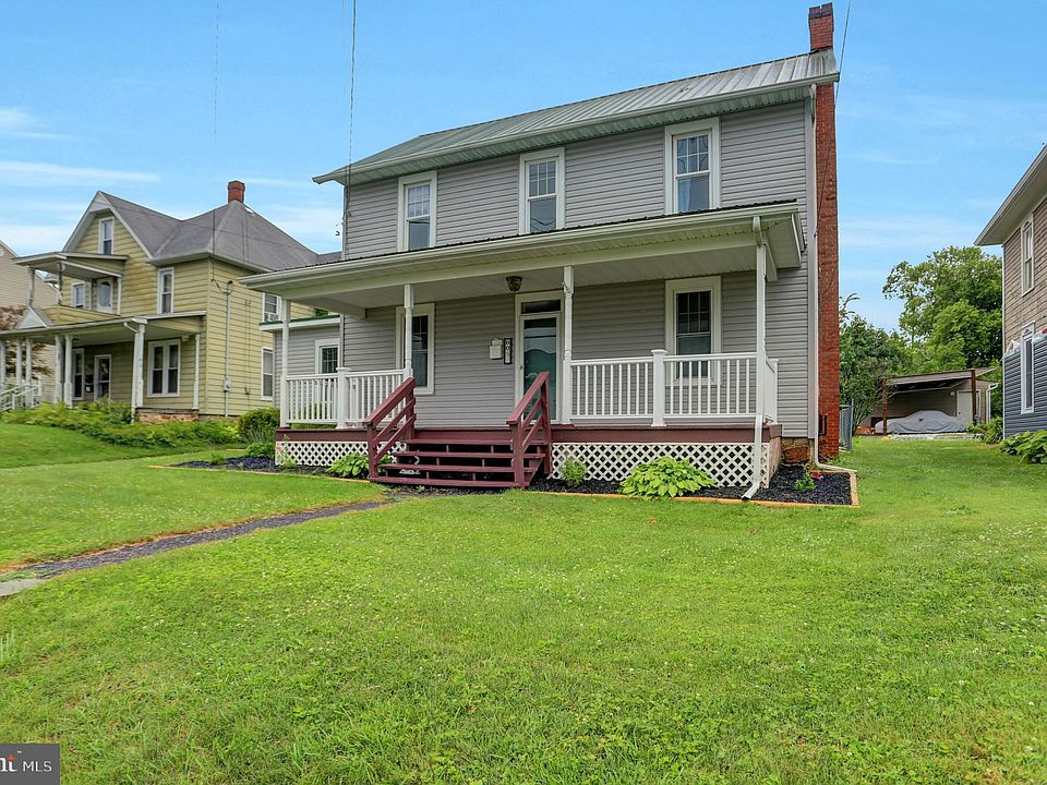Large colonial 4 bedroom, 1.5 bath, home located in the boro. Home has a large living room, separate dining room, spacious kitchen with laundry closet. Located off dining room is a Family room/main level bedroom with 1/2 bath. Upstairs, has full bath with heat, 2 bedrooms and the Primary bedroom. Primary bedroom has walk in closet. Full Attic, with walk up stairs for storage. Patio in the back of the home is covered , great for entertaining. Rear yard is partially fenced. Freshly landscaped. Two sheds, with electric run to them, one could be a workshop , both located in back yard. Off street parking on a gravel driveway . Walking distance to the high school, shopping, and restaurants.