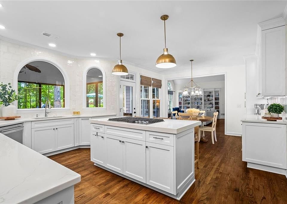 Nestled in the heart of Alpharetta this renovated home in Windward seamlessly blends timeless charm with modern luxury. This home has been updated throughout no detail has been overlooked. The remodeled gourmet kitchen with quartz countertops, all new custom cabinetry, top of the line stainless steel appliances, floor to ceiling tile, hidden charging station and beverage bar with wine cooler will exceed your expectations! The kitchen enjoys a charming eating area and leads out to the screened porch and large deck overlooking the private wooded back yard. This home offers many flexible living options for any lifestyle. Open vaulted ceilings in the family room with brick fireplace and custom built-in cabinetry, beautiful newly refinished hardwood floors connect to the entire first floor including the guest suite/office with a Murphy Bed cabinet and built-in book case. Luxurious formal living and dining rooms that have convenient access to the grilling deck. Hardwood flooring throughout the entire second level including the primary suite a serene retreat complete with a spacious en-suite bath featuring spa-like amenities: all new custom cabinetry, a soaking tub, a large tile shower, floor to ceiling tiled water closet and a double vanity with quartz countertop. Plus a walk-in closet offers custom built-in shelving, Three additional guest bedrooms all have access to the remodeled guest bathroom completely remodeled with tiled shower, new cabinetry, double vanity quartz countertop. One bedroom is large bonus/bunk room with a walk-in closet with custom built in cabinetry. The basement is unfinished, stubbed for a bathroom with plenty of windows and access to an under screened porch patio. Windward has been designed to take full advantage of the private 200 acre Lake. Lake Windward is home to Pontoon Boats (electric motors only), Sail Boats, Kayaks, Paddle Boards and Canoes. Lake use is restricted to Windward residents. This community surrounds the Golf Club of Georgia. Windward Lake Club offers a private membership for Swim and Tennis. The fishing is great too!