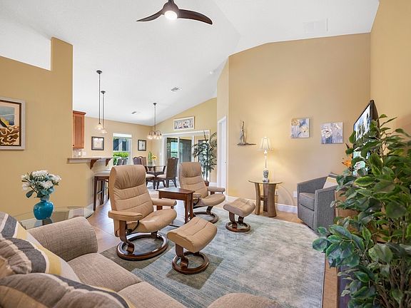 2015 hidden gem is discreetly located in the newer Phase III - away from the Heavy Traffic Flow & near the bk Entrance; all w/in a short walk to the Seb. Municipal 18 hole golf course & pickleball courts. Bright & open concept living w/vaulted ceilings. Kitchen features light quartz countertops & hardwood cabinetry. PGT IMPACT WINDOWS throughout & Remote Controlled Roll Down Sun/Wind Screen(s) for Peace of Mind. Primary ensuite offers sitting area & ample closet storage. Tile flooring throughout the home. Energy efficient Geospring 50 gal. water heater. Offered FULLY TURNKEY! rmszappr&sub2err