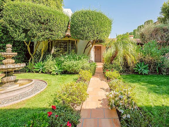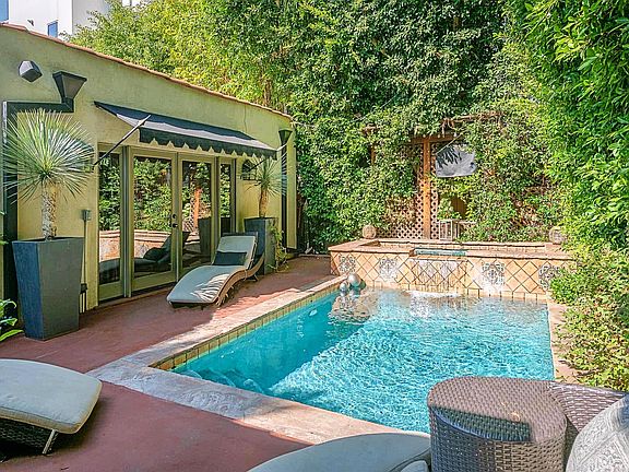Welcome to this exquisite Spanish Revival Pool Home situated in the heart of West Hollywood. This classic Spanish property has been stunningly re-imagined and restored with elegant custom finishes throughout. A fountained courtyard entry leads you into this beautiful home offering wonderful proportions, executed with glamour and charm. Situated on a generous lot, this secure and private retreat is nestled within over 30 foot tall hedges with mature and meticulous landscaping, for ultimate privacy. Designed with indoor/outdoor living in mind, you will discover multiple outdoor spaces all of which flow with French doors and windows. Highlights include; a gourmet kitchen with top-of-the-line European appliances, a built-in breakfast nook with french doors leading out to a romantic front porch; 4 generous bedrooms and 3 spa-like bathrooms. The custom primary suite, overlooking the yard and pool, features an en-suite bathroom with skylights, a spa tub, custom tiled shower, three closets, and French doors overlooking the pool and yards. Formal dining room with dramatic step-down living room, fireplace, and original stained glass windows, barrel ceilings, and espresso oak floors. A sparkling pool and spa within the fully gated, expansive grounds, creates resort-like living, perfect for entertainers and families alike.The detached, bonus structure makes for a wonderful private gym, home office or studio. A short walk to the designer boutiques of Melrose Place, and LA's most famed eateries.*EV Parking, built-in whole home surround sound throughout. Short or long term.* owner will pay for gardener and pool service