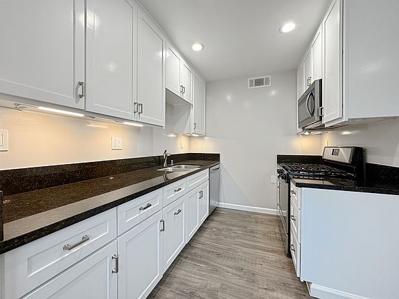 Remodeled Large Elegant Residence located in this highly sought after Mid-Century style building with Private Patio, Plenty of Storage, In Unit Laundry hoop-ups, Central Heating and Air Conditioning, Covered Parking and Open Concept Living Area. This home has an abundance of large dual pane windows that fill the home with great natural light, a spacious Private Patio and open concept living area. The Updated Kitchen offers plenty of beautiful cabinetry, Dishwasher, quartz countertops, gas range/oven, microwave, garbage disposal and open concept dining area. Additional wonderful features include: Central Heating and Air Conditioning, new premium laminate floors, Freshly Painted interior, Private Patio, beautiful smooth ceiling, ceiling fans, window blinds, custom closet, recessed lighting, convenient USB charging outlets and the unit is cable ready. The Bathroom is Updated with a new medicine cabinet, newly installed handheld shower head, ceiling fan/heater and new vanity. The bedroom features new beautiful mirrored sliding closet doors with plenty of Custom Closet built-ins for plenty of storage. Parking is Included in the rent! The on-site extra clean Laundry Room has easy phone app pay. The proximity of this home offers quick access to the metro/freeway and is conveniently located near South Lake & Old Town Pasadena shopping & dining district. Pet Friendly Community! Apartment has been virtually stagged. Parking is included in the rent, NO pet rent or extra security deposit, (water, trash and gardening included in rent), laundry, private patio, small building, extra clean remodeled residence and tree top views from patio.