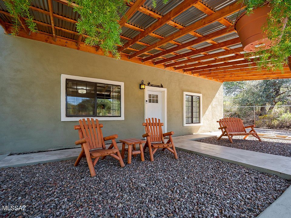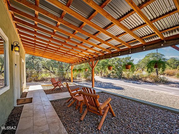 - Features: Adjacent to Wash, East/West Exposure, Landscape - Front: Low Care, Natural Desert, Shrubs, Trees, Landscape - Rear: Natural Desert, Shrubs, Sprinkler/Drip, Vegetable Garden, Landscape - Rear (Other): Greenhouse
