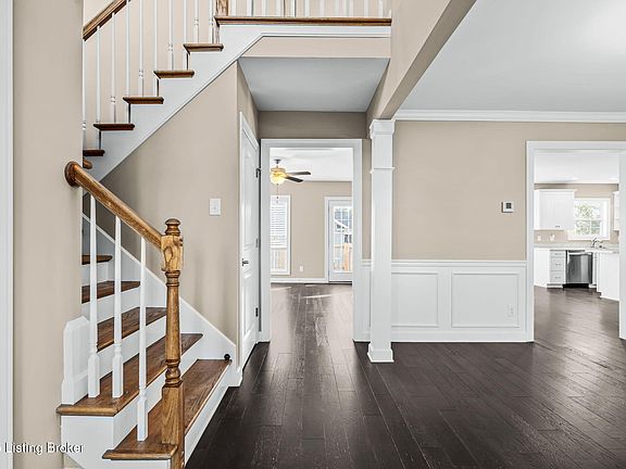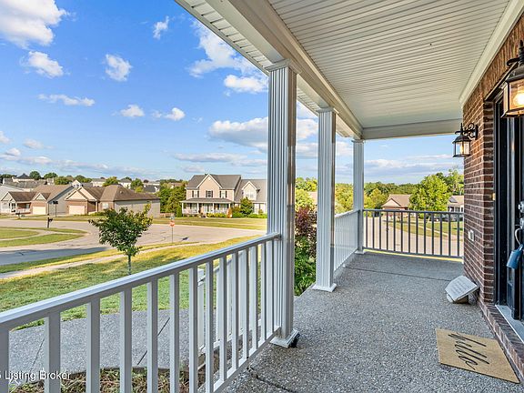 Welcome to Falcon Ridge, just minutes from Historic Downtown LaGrange! This inviting home offers 4 bedrooms, 2.5 bathrooms, and a walkout basement. Step onto the charming wraparound front porch and enter into the first floor, where you'll find a spacious great room with a cozy gas fireplace, open to the kitchen featuring a center island, stainless steel appliances, abundant cabinet and counter space, pantry, and an informal dining area. A formal dining room with crown molding, a convenient half bath, and a laundry room complete the main level. Upstairs, the generous primary suite includes a private bath with dual vanities, tile flooring, a tub, and a separate shower. Three additional bedrooms and a full hall bath provide plenty of space for family or guests. The finished walkout basement extends the living area with a large family room, plenty of storage, and plumbing ready for a third full bath. Outdoors, enjoy gatherings on the deck overlooking the backyard, with the added benefit of a corner lot. All this just moments away from LaGrange's farmers market, local shops, restaurants,, annual festivals, and the award-winning Oldham County Schools-offering the perfect blend of small-town charm and modern living.