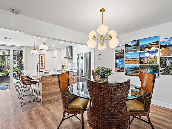 The kitchen is a stunning display of coastal modern design, featuring sleek flat-panel cabinetry imported from Italy, Cambria Brittanica jumbo quartz countertops and marble backsplash, and an expansive 11-foot island provides ample seating and includes a deep stainless steel sink. Storage is abundant, with full-extension drawers and pull-outs in the pantry and lower cabinets. The refrigerator, induction range and dishwasher are all newer.