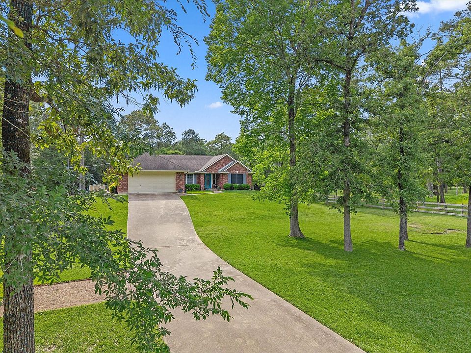 Nestled on just over an acre, this one-story home offers space, comfort, and a serene setting. The open-concept living area features soaring ceilings, a cozy fireplace, and tile flooring throughout the main spaces. The kitchen beautifully remodeled includes stainless steel appliances, Whirlpool 5-Element Electric Range featuring a True Convection Oven and Integrated Air Fryer the perfect blend of style, performance, and innovation.Rich wood cabinetry, and an oversized breakfast bar ideal for entertaining. Enjoy meals in the sunny breakfast nook or the formal dining room with large windows overlooking the lush front yard. The spacious layout includes 4 bedrooms and 2 remodeled baths. The private primary suite boasts a walk-in shower, dual vanities and spacious walk in closet. New ceiling fans and light fixtures. Extensive landscaping includes paver borders, walkways, dirt work, tree removal, sod, fencing and gates. Mature trees and expansive green space offer privacy and peaceful views.