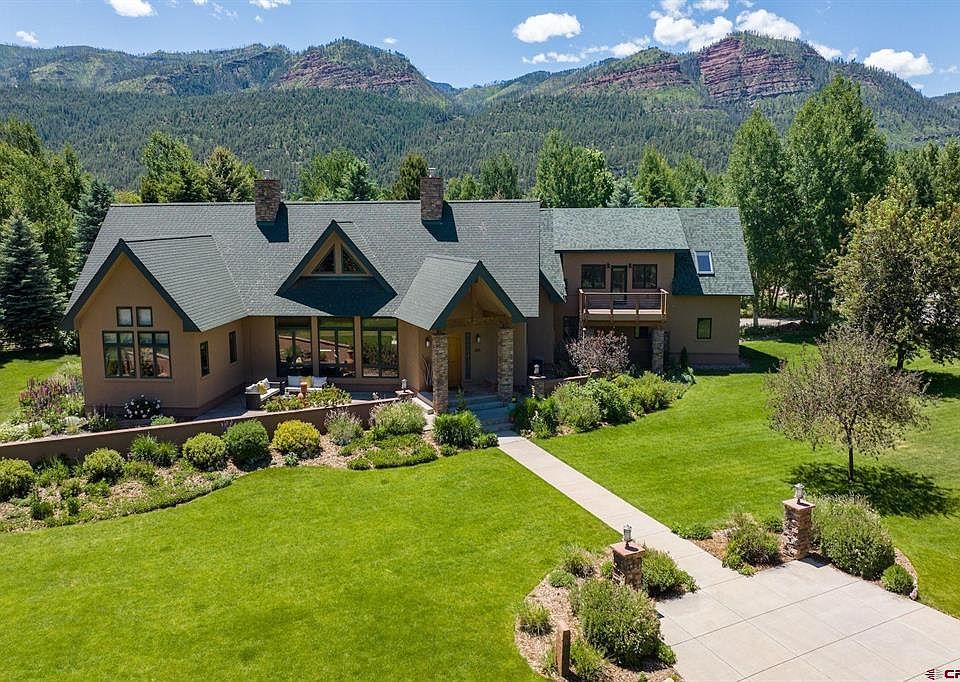One of the most sought-after neighborhoods in Durango, Red Rock Ranch, is located in the Animas Valley. This exclusive neighborhood of fine custom homes delights with the mature landscaping, park like setting with its own pond for fishing and enjoyment. The 5 bedroom, 4 ½ bathroom home offers a blend of luxurious features and breathtaking natural surroundings. This beautifully maintained home was designed to capture abundant natural light and the valley red rock mountains. Set on .87 acres, with a partial remodel in 2023 which added 1,432 SF of living space. The interior of the home features dramatic ceilings in various rooms, Aspen ceilings in the great room and kitchen, with custom lighting fixtures. The kitchen includes modern amenities such as above and under cabinet lighting, stained maple alder cabinets, a pantry with built-in shelving, glass tile backsplash, granite slab countertops, and full extension drawers with custom pulls elevate the aesthetic appeal. Just off the kitchen is the laundry room which has updated tiles floors with tall storage cabinets, a new washer and dryer, and adjacent powder room. The main level primary bedroom offers amazing Red Cliff views, his and her walk-in closets, complete with custom built-ins, ample storage space, along with double vanities. The main level also offers a 2nd ensuite bedroom with an updated bathroom. The bonus room, part of the 2023 addition is located off the kitchen and serves as a versatile space for entertainment and relaxation. With wood flooring, a built-in kitchenette (full-size refrigerator, wine refrigerator, full sink), includes a wall of custom storage cabinetry, this room is perfect for hosting gatherings, a den room for the kids, workout, schooling room, etc. There is a new smartly designed built-in storage/mudroom area adjacent to the garage entry. The upper level, considered the 2nd wing of the home, includes the 3 additional bedrooms. The first bedroom has a full bathroom across the hall, as you continue down the hallway, you will find an office/living room area that leads to a large walk out upper deck to enjoy the amazing views. The other two spacious bedrooms are connected with a jack and jill bathroom (shower and toilet separated), finished with modern fixtures. The exterior showcases lush lawns, mature landscaping, various trees including spruce, pine, aspen, and a Canadian Chokecherry orchard (perfect area for hanging hammocks), along with a fenced garden area and an 8x10 garden shed. The partially fenced backyard (once fully, can be easily enclosed), front walled patio, and private back patio with a new 2022 hot tub provide serene outdoor retreats and entertaining areas. Concrete driveway leading you to the heated 3 car garage, and a separate 2-car parking pad out front. The garage is spacious, and equipped with insulated doors, connected to a security system. The home includes a new high efficiency forced air heating system (2022) with 3 zones, and air conditioning, whole house water filtration, water softener, circulation pump for hot water, reverse osmosis water system for the refrigerator and kitchen sink, and Beam central vacuum system with additional extra-long hose for the garage. The entire house was updated in 2023 with carbon monoxide, fire, and security systems. Including a full 1 acre updated irrigation system with spray irrigation for bark beds and flowerpots. All exterior water is included through the HOA water rights!