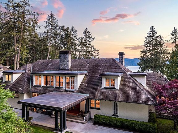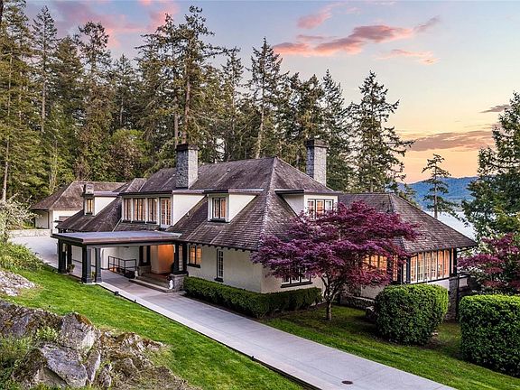 Masterpiece of architecture! Waterfront estate on 5 acres. Sweeping water views from all principle rooms. Chef's kitchen with custom cabinetry, stone counters & high-end appliances. Dining area provides a refined setting. Stylish living rm with fireplace & access to a covered deck. Primary suite with walk-in, fireplace, 3pc ensuite & deck access. 2nd bedrm, study, family rm, mudroom & bathrooms complete. Above, 2nd primary suite with 5pc ensuite & walk-in, 2 more bedrms, 2 baths, balcony & attic storage. Below, an entertainment haven with billiards rm, media rm, sitting area & changing rm. Separate 2 bedroom caretaker/guest cottage. Gently sloping south facing estate has 2 distinctive waterfront features. Exceptional outdoor living including a swimming pool, lots of patio spaces, trails & gardens. Workshop with 12ft garage, plus a garage, tool shed & chicken coop. Explore the surrounding waters from your yacht, with the convenience of a boathouse with a mechanized marine way.
