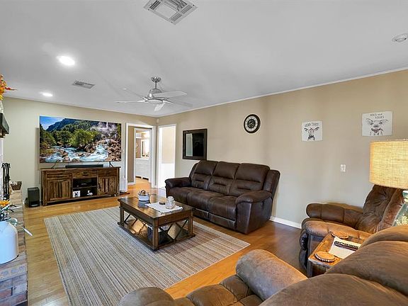 Welcome to the neighborhood. It has 3 bedrooms and 2 baths. A large living room that has wood flooring, a wood burning fireplace with/gas starter and sliding door to the patio. The kitchen has an eating bar, tiled backsplash, white cabinets, gas range, dishwasher, and a microwave oven/vent. There is an abundance of counter space and built-ins. Tiled floor in the kitchen and wood floor in the dining. There are cabinets in the laundry room and the washer and dryer will stay. The guest bath has double vanities, tub/shower combination, tiled flooring and a large built in linen closet. The primary bedroom has a walk-in closet. The primary bath has tiled flooring and a large walk-in shower and a commode area that has a door to close it off from the vanity area. All the bedrooms have ceiling fans and new carpet. The Sellers have replaced all the interior plumbing with pec pipe. The windows are thermal energy efficient and tilt-in for easy cleaning. There are blinds on the windows. The water heater was replaced in 2023. The gutters and downspouts were recently installed and a fresh coat of paint on the exterior completes the update. The two car-garage has a fold down ladder to attic and space. There is room for a freezer or additional refrigerator in the nook of the garage. The garage door is new. The breaker box was replaced. There is a large backyard with a wood fence on concrete runners. A spacious covered patio to relax, entertain or BBQ.
