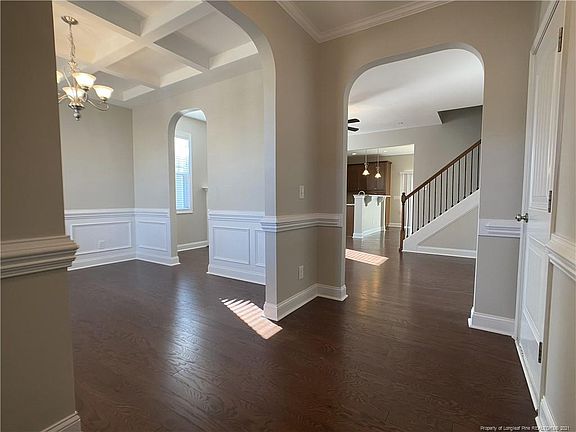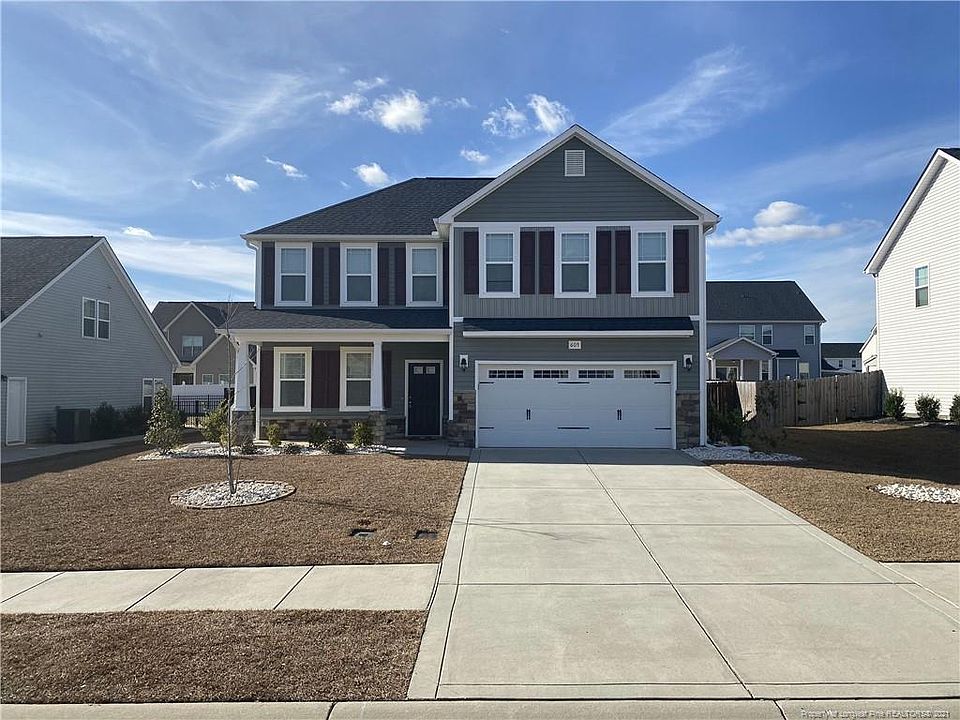 Gorgeous 4 bedroom 2 ½ bath home with upstairs loft area in desirable Bedford Community. Home has been freshly painted inside. First floor features a Formal Dining w/ coffered ceilings, large open Family room with fireplace, Breakfast area leading out to covered patio, half bath and Master En Suite. The second floor has 3 large bedrooms, 1 full bath, laundry closet, and huge open loft perfect for entertaining upstairs. Home boasts lovely dark hardwood laminates flowing throughout first floor, granite counter tops in kitchen, SS appliances, kitchen island with bar seating, and a fully fenced spacious backyard. Wonderful community includes clubhouse, pool, fitness center and other amenities offered. No city taxes and close to Fort Bragg, I-295 access, Fayetteville and Southern Pines.
