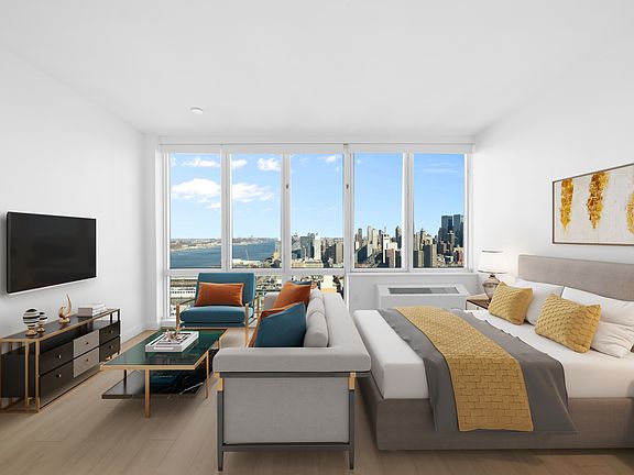 Arrive through the gracious motor court adorned with signature artwork and enter a grand lobby showcasing a custom chandelier, fireplace, and library. Each residence at Sky features a warm, neutral palette and custom details, including Italian crafted kitchens with quartz countertops, European appliances, and Olympic Gray porcelain-tiled bathrooms. Full-height window walls offer stunning views of the Manhattan skyline, Hudson River, and beyond.