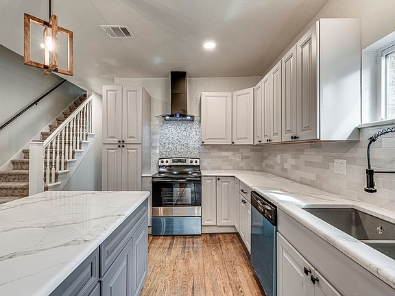 Beautifully renovated half duplex for lease, blending modern updates with original charm! High ceilings and original hardwood floors highlight this 2-bedroom, 1.5-bath home, offering both character and convenience. The stunning kitchen features a large island, soft-close drawers, a spacious sink, and stainless steel appliances. Enjoy updated bathrooms, under-stair storage, and new windows, lighting, and appliances throughout. One bedroom is upstairs with an attached half bath for added privacy. A shared laundry space with the other unit is conveniently located in a separate room behind the home. This unit also includes a new fence, a long private driveway, and a private back patio perfect for relaxing or entertaining. Prime location near I-35, just minutes from Bishop Arts District, Kessler Park, and Stevens Park Golf Course offering easy access to top dining, shopping, and entertainment. Don't miss this charming and updated home in an unbeatable location!