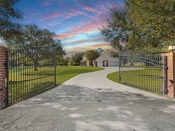 Discover Lake Front Porch Living in the City at 6050 Redhead Lane - an exceptionally private, fully gated 5.26-acre retreat tucked at the end of a residential street within Hunters Terrace Estates. Centered around a stunning 2-acre lake, fully stocked with bass and catfish for over 25 years, this property delivers a true acreage lifestyle inside the city limits. Enjoy paddleboarding, fishing, kayaking, and nightly south-facing sunsets from your own dock. The custom Tigerland Homes ranch-style residence features a 47'x10' front porch overlooking the water, vaulted ceiling, crown moulding, breakfast bar, jetted tub with separate shower, and a home office. Outdoors, a covered back patio, oversized 3-car garage, storage shed, and separate pole barn add versatility. With a low tax rate, no HOA, recent A/C, mature trees, and unmatched serenity, this is one of Katy’s most rare and inspiring lakefront opportunities. Enjoy peaceful breezes, starry nights, & a true country feel within the city.
