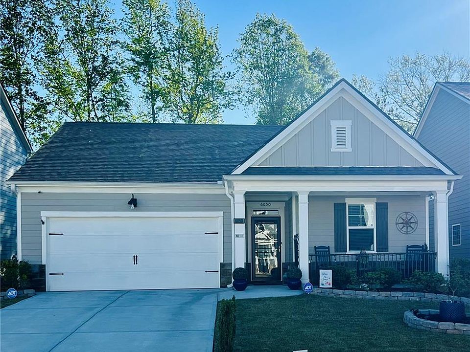 Gorgeous 4-Bedroom Ranch in Desirable Flowery Branch. This beautiful 2-year-old, 4-bedroom ranch is in better than new condition and is situated on a lot backing up to a peaceful meadow and walking trail. Watch the deer and enjoy the peaceful setting from your screened-in porch, or from the patio, covered by a brand-new retractable awning! Within walking distance of downtown Flowery Branch and Safe Harbor Hideaway Bay. You can park in the 2-car garage because this garage has an overhead racking system. The refrigerator, washer & dryer stay with the home. The primary bath has a spacious tiled shower, soaking tub, and double sink vanity. Newly installed gutter guard system on the home, plus many other upgrades.