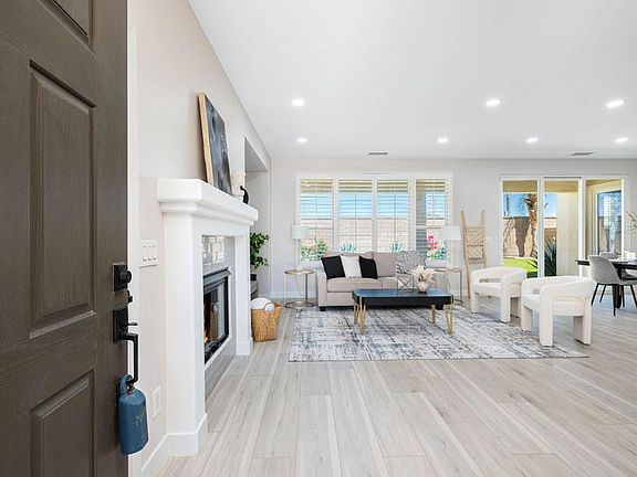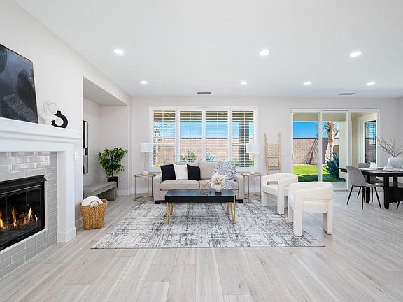 Welcome to Trilogy La Quinta, an exclusive 55+ resort community, where you'll find the epitome of luxury living in this stunning Oasis plan spanning 1580 square feet. This meticulously designed residence features 2 bedrooms and 2 baths, highlighted by a spacious great room adorned with plank flooring and a charming tile-surround gas log fireplace. Plantation shutters and a TV/Media niche add to the ambiance. The dining area is complemented by a hutch cavity and a soothing interior color scheme. The adjacent Chef's kitchen is a culinary haven, boasting granite counters, a peninsula with bar seating, black appliances, a prep island, pantry, and a gas range. Guests will enjoy their accommodations with a nearby full bath featuring a quartz counter, back-lit mirror, and shower-over-tub configuration. The primary retreat offers a slider to the back patio and an en suite bath complete with a dual vanity, large shower enclosure, and spacious walk-in closet. For added convenience, a separate laundry room with cabinetry is included. Outside, the rear yard presents a blank canvas with an extended covered patio and expansive views. Enjoy quick access to the Santa Rosa Clubhouse and its plethora of amenities and activities, just a short 5-minute golf cart ride away.