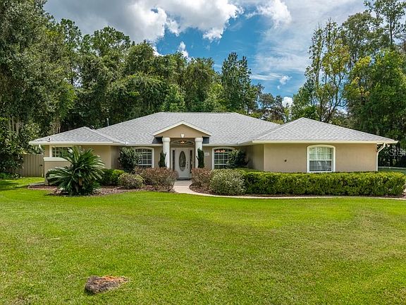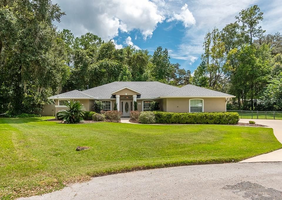 Welcome to this beautifully updated 4 bedroom, 2.5 bath home situated on a private ½ acre lot with a fully fenced and professionally landscaped yard. The highlight of this property is the completely remodeled screened pool featuring elegant glass tile, travertine stone decking, a covered outdoor lanai, outdoor shower, and half bath —perfect for year-round entertaining. Inside, cherry hardwood floors flow throughout the home. The living room boasts vaulted ceilings with expansive views of the pool, while the spacious kitchen opens to the great room and features stainless steel appliances, granite center island, and an extended counter with bar seating. A separate dining room adds to the home’s appeal. The huge master suite offers a relaxing sitting area and spa-inspired bath with a soaking tub, walk-in shower, and dual vanities. Generously sized guest rooms and an updated main bath with marble counters complete the split bedroom plan. Additional conveniences include an inside laundry room with utility sink. Recent upgrades provide peace of mind: new roof, fully replaced HVAC system with main heat pump and air handler, new hot water heater with on-demand system, water softener, 22KW Generac generator with 500-gallon underground propane tank, and Ring surveillance system. This home blends modern luxury with functional design—move-in ready and designed for comfort and style.