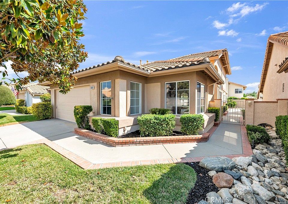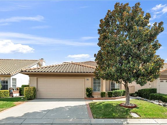 Lovely Muirfield model in Sun Lakes Country Club, a stunning 55+ community in Banning. This 3-bedroom, 2.5-bath home with loft and family room offers 1,846 sq. ft. of comfortable living. A double-door entry welcomes you into a bright, open floor plan with abundant natural light and freshly painted white walls. The spacious living and dining areas flow nicely for entertaining. The kitchen features ceramic tile flooring, updated painted cabinets, and appliances including the refrigerator. The downstairs primary suite is open and airy with a sliding door to the patio and an en-suite bathroom featuring dual sinks. Upstairs has been fully refreshed with all new carpet, paint, and ceiling fans in each room, along with two bedrooms, a full bath, and a loft area. Other highlights include mirrored closet doors, ample garage storage with built-in cabinets and attic ladder, a solid Alumawood patio cover, fresh exterior paint, new landscaping, and new carpet throughout the home.