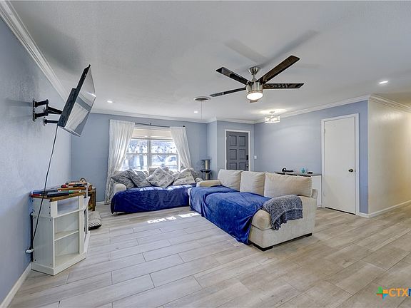 Welcome home! This modern 3/2/2 residence features a contemporary kitchen, granite countertops, and tile flooring in the living areas, along with crown molding and a newer HVAC system from 2021. Relax in the sunroom and enjoy the gorgeous galore backyard, complete with mature trees and outdoor patios perfect for year-round gatherings. The bonus building offers FLEX space, equipped with electricity and a window unit, ideal for guests or whatever your real estate creativity envisions. Located in North Belton, this home is conveniently within walking distance to an elementary school and two parks! Schedule your tour today!