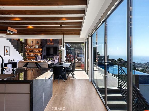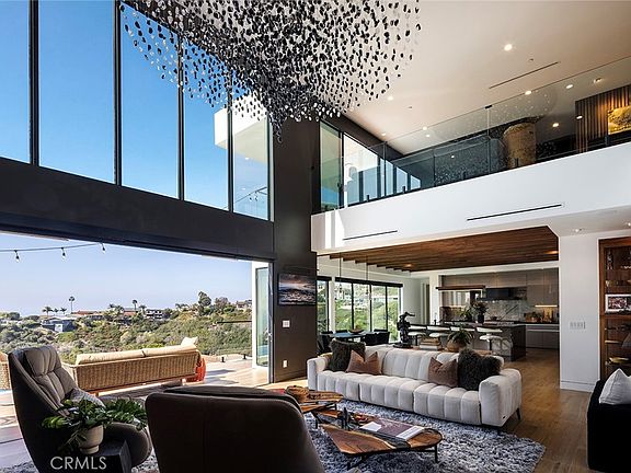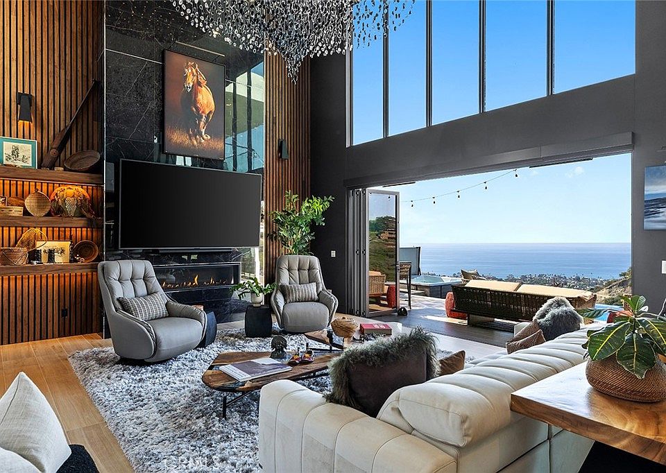 Spanning approximately 4,232 sqft on a 13,504-sqft lot, the residence features four bedrooms and four and a half bathrooms, each space shaped by intentional design and natural light. Step through the oversized pivot door into a grand two-story great room where an iconic hotel chandelier floats above handcrafted walnut beams. Walls of La Cantina glass vanish with a touch, merging ocean air and modern architecture into one seamless experience.