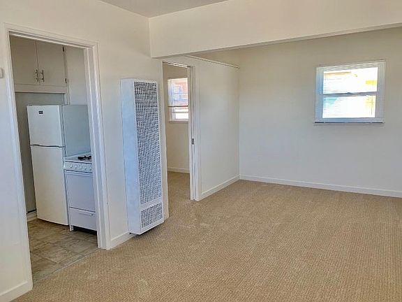 ONE BLOCK TO THE BEACH!! This cozy upper rear unit offers a kitchenette with stove & fridge, new carpet & vinyl, ceiling fans, a wall with pocket door separates the living area from the sleeping area for privacy. A deck off the front door with a small ocean view. Shared courtyard. Coin laundry. Close to shops & restaurants. Can't beat this location! Cat OK. Please call 310-546-7777 or email tmc1020@aol.com to view. Tenant Responsible For Gas and Electricity