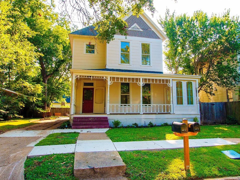 Historic District, the Doyle House is fully refurbished 1933 historic charm while incorporating modern conveniences. 3 bedroom, 2.5 bath, 2,457SF home PLUS a detached income producing 300SF studio. Formal living & dining rooms with tray ceilings, 2 fireplaces, & built-ins. Open-concept great room features high ceilings & new kitchen with statement island & storage, walk in pantry, new 4-burner gas range, dishwasher, refrigerator, & farmhouse sink. Back deck leads to outdoor entertainment with patio space, lawn, professional horseshoe pits, dart board, & fire pit. Restored original wood floors throughout. Spacious primary suite with a large sliding tri-panel closet & an en-suite bath with shower over original cast iron claw foot tub, dual sinks, & updated fixtures. Large secondary bedrooms. Dual efficient mini splits for heating & cooling, ceiling fans. Inside laundry. Concrete driveway.