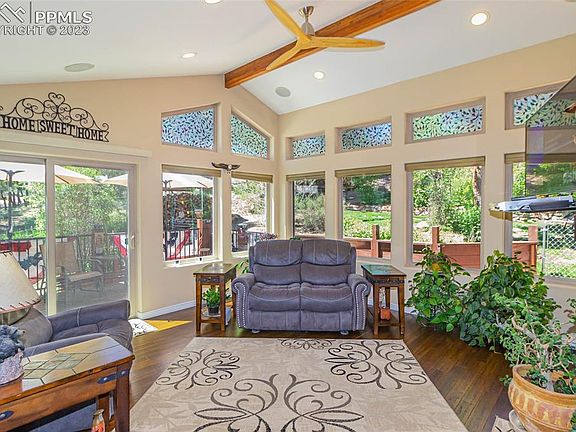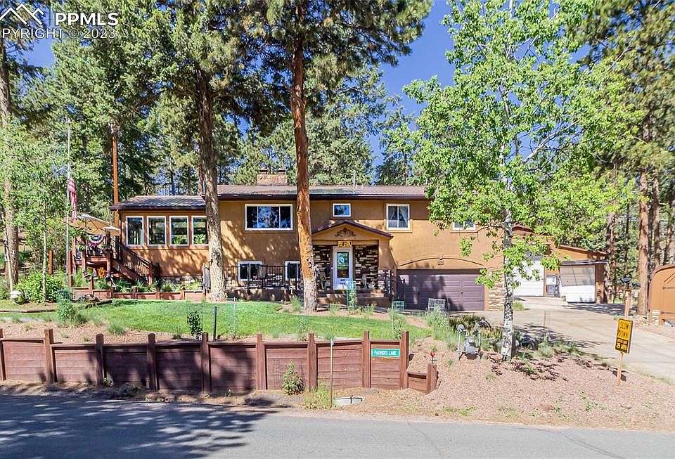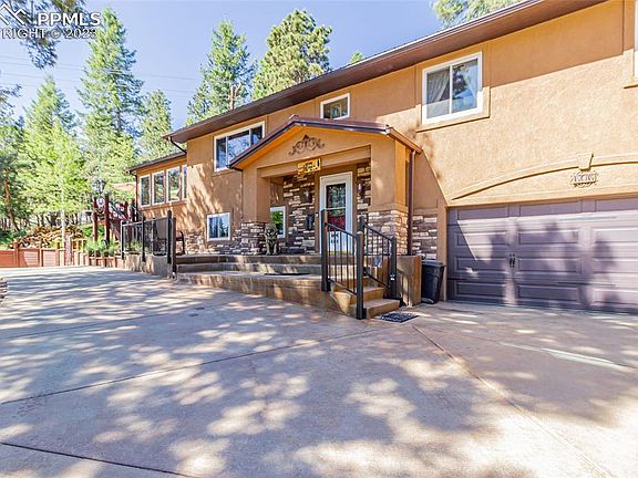 Mechanics dream! Meticulously remodeled home in central Woodland Park, perfectly setup for car aficionados! Pride of ownership is obvious with numerous, premium upgrades throughout. Special features include gourmet Kitchen, spacious Master Bedroom Suite, Sunroom addition, vaulted ceilings, built-in speakers, custom blinds, recessed lighting, heaters in bathrooms, porcelain tile floors, 4 fireplaces, and so much more. Gourmet Kitchen has granite counters, premium maple cabinetry and hood, built-in wine/plate racks, center island with seating, bay window, and new refrigerator & stove. Large Master has 3 closets, sitting/dressing area, & adjoining bath with custom tile shower. Sunroom addition is simply beautiful: radiant in-floor heat, bamboo floor, 16 windows for natural light, push/pull blinds, built-in electric fireplace, & walks out to sunny16x7 composite deck with powder coated rails. Attached 2-car Garage has finished walls, insulated door, vinyl coated mat floors, cabinets, racks, and bonus room in the back that is perfect as an exercise room. Detached Garage has 2 bays; one is high enough for a lift where you can store a car above while parking a car below. The other bay is great for ATV or motorcycle parking, and there is enclosed office space and woodstove. Additional enclosed carport is setup for painting cars with extra bright lighting and fan. The outdoor living space is a private oasis in the woods! Flagstone paths lead all around and up the multi-tiered landscaped backyard that is fully fenced. Water feature, koi pond, grilling space, flowers, shrubs, mature trees, sunny, shady, and a hot tub pad wired and ready for yours to move in. Colored concrete circular drive and parking areas are not only beautiful, but make snow removal much easier. Home is in city limits near shopping, entertainment, and schools. Colorado Springs is only 25 minutes away. There is so much more, too much to mention here, so you must see this Beauty for yourself! Don’t delay!