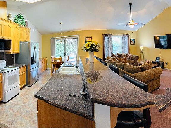 Fenced backyardKitchen islandPrivate outdoor retreatVaulted ceilingShaker cabinetsStone countertopsKitchen bar