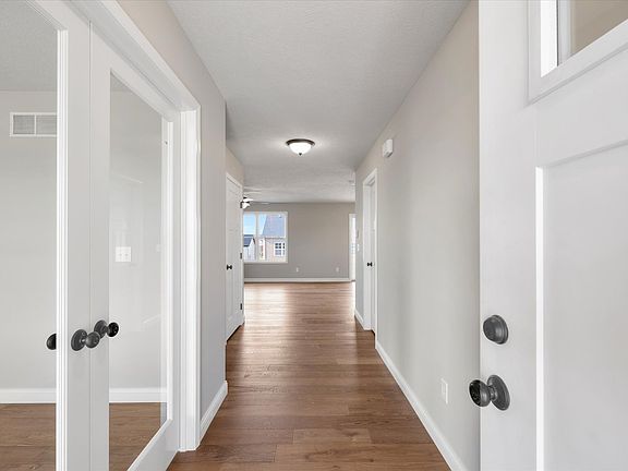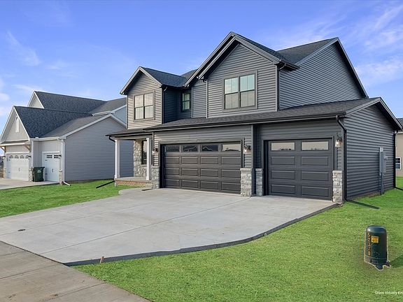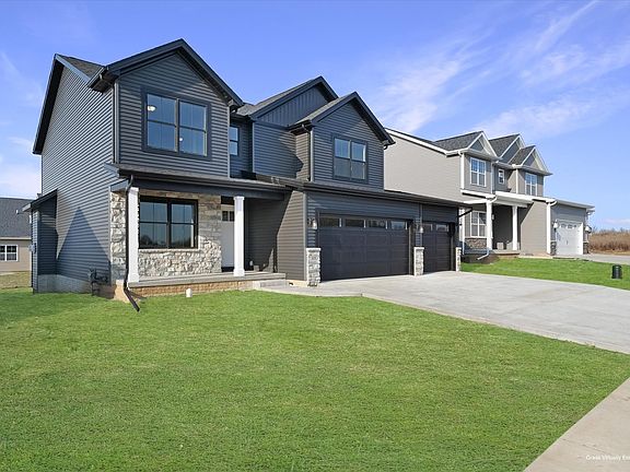 What a bold eye-catching 2 Story over a daylight basement in Sangamon Fields.  Newly built with all the details in mind and this one pulled out the stops. Bold dark siding with black doors and stone accents. Covered porch with cedar posts and a 3 car garage. Trendy hardwood floors sprawl throughout the first floor. Custom kitchen offers wall to wall cabinets tops with quartz countertops and a walk in pantry. Large oversized square shaped island with pull up chair space. Vented exhaust hood above the range. Convenient drop-zone just off the garage on your way to the kitchen. Drop-zone was custom built with backdrop, hooks, and basket nooks. The super popular 2nd floor laundry accompanies the 4 upstairs bedrooms. Large landing disperses you to your bedrooms. Master bedroom is oversized and offers vaulted ceilings. The ensuite offers dual vanity sink with sleek white marble tops, wall to wall mirror, tile shower with glass doors. Master is also accompanied by a large walk in closet. Basement plans on file and can quickly be quoted upon request. This builder has been building for years and isn't going anywhere soon. They have an outstanding reputation in the community and stand behind their product. If you are looking for quality and a home that was built by experience, then you found your home.
