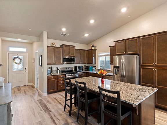 The kitchen features lots and lots of storage space. Having a large kitchen island with granite countertops provides lots of space for growing families or for those who need extra cooking space.
