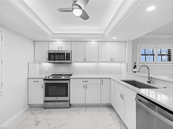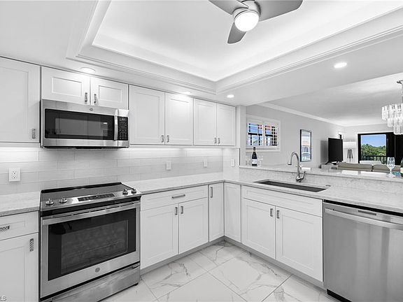 This TOP FLOOR Chateaumere residence in Pelican Bay is a RARE and FULLY REMODELED gem! It's one of only two top-floor homes with no adjoining walls to other units. The top floor features spacious walkways and a large balcony with east lake and golf course views. It is being offered turnkey furnished with trendy, contemporary-style decor and is equipped with new kitchen appliances, quartz countertops, subway tile backsplash, ample pantry space, a new washer/dryer, smooth wall finishes, plantation shutters throughout, porcelain flooring, enclosed lanai with hurricane-resistant sliding glass doors, and roll-down blinds. The bathrooms feature custom modern tile shower walls, and ALL plumbing has been replaced. Chateaumere offers 3 pools, a fitness room, and a clubhouse on 10 acres of pristine property. The Pelican Bay HOA membership provides access to nearly 3 miles of beaches, two private gulf front restaurants and very popular casual bar. It is conveniently located in the heart of Naples, minutes away from upscale shopping and dining at Waterside Shops and Mercato Plaza. If you are looking for a property that combines live-in luxury and investment potential, your search ends here!