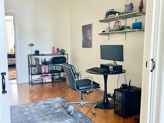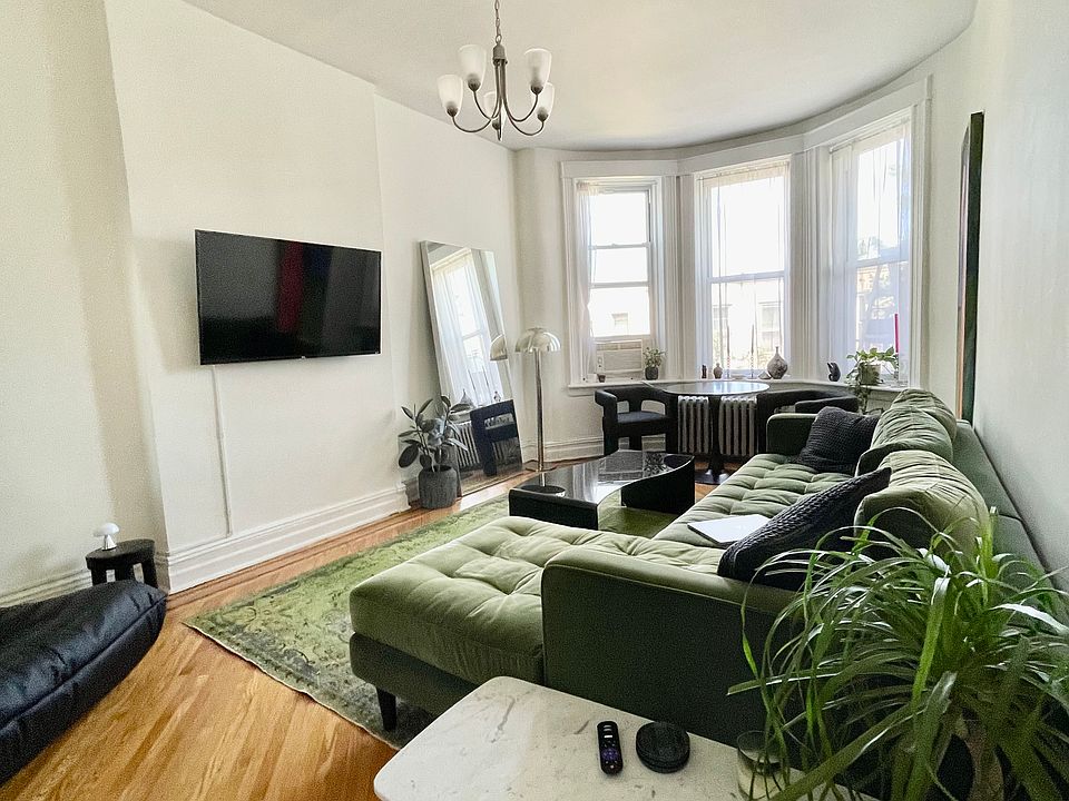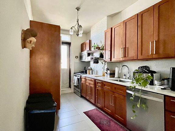 Available now is a delightful, very sunny, 1200 sf floor-through apartment located in a 3 family building. Apartment comprises of 1 king size bedroom with an alcove, a good size office, dining area, large living room, and kitchen. The unit features high ceilings, huge 7ft windows offering ample natural lighting, original oak floors, and 4 large closets. Large eat-in-kitchen offers stainless steel appliances that include dishwasher, microwave with an external hood, convection range/oven, double/french door refrigerator with water/ice dispenser, lots of cabinet space, quartz countertop, and beautiful glass tile backsplash. There is a small balcony right of the kitchen where you can enjoy your morning coffee. Heat and hot water are included in the rent. Located in Historical Central Ridgewood District near shopping, great restaurants, cafes, and bars. Easy access to Manhattan and just short 2 blocks from the M train. Sorry no pets.