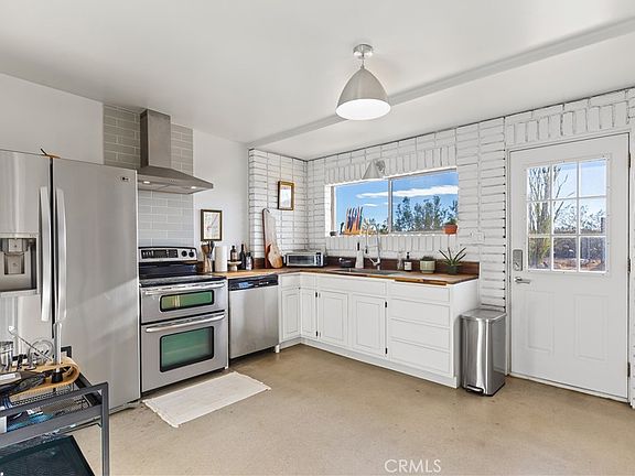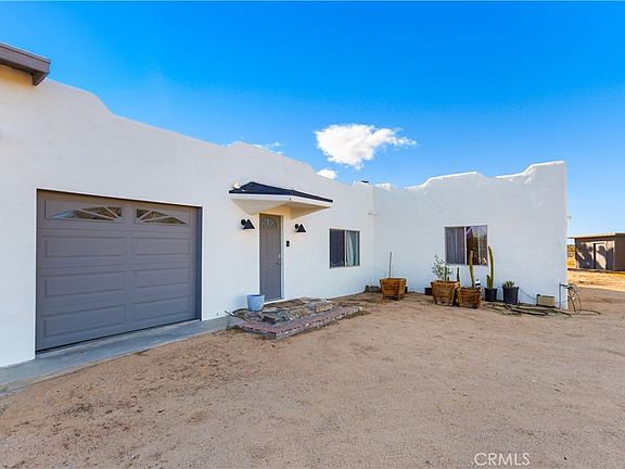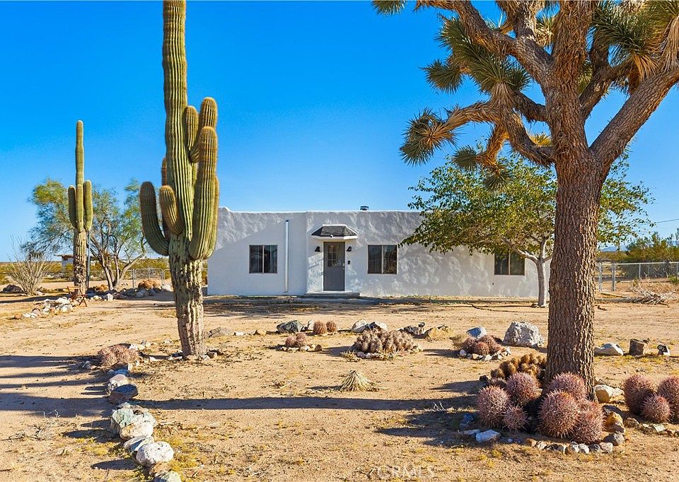 Escape to 5 private acres where desert magic meets mid-century charm. This 1956 home blends vintage character with modern comfort - polished concrete floors with stunning aggregate detail, a cozy wood-burning fireplace, and brand new ductless heating and cooling for year-round comfort. The home's open floor plan connects living and dining spaces flooded with natural light. Three bedrooms capture gorgeous afternoon sun, while the primary suite features a walk-in closet. French doors open to a versatile third room - perfect home office or creative space. The huge 770+ sq ft garage offers many possibilities - in fact, the original owner built a private airplane inside. Whether you envision a workshop, art studio, or conversion to an ADU, you're looking at over 2,200 sq ft of potential. Two detached storage sheds provide ample room for all your desert toys and equipment. Your 5 acres showcase the desert's natural beauty. Two giant saguaro cacti (decades old) stand alongside a majestic Joshua Tree all in your front yard - treasures rarely found in private yards, even in the desert - while ocotillo, barrel cactus, and fan palms create layers of desert texture. Every sunset paints the sky electric. Every clear night offers an out-of-this-world view of the stars. The privacy and tranquility of this property make it an ideal desert retreat or full-time residence.