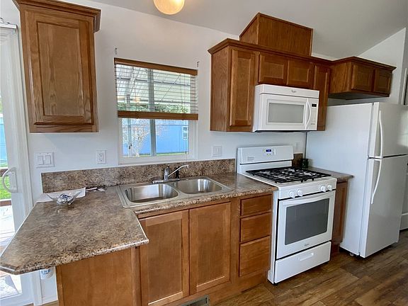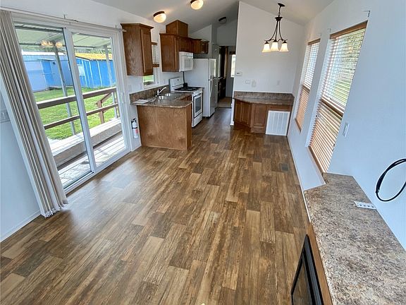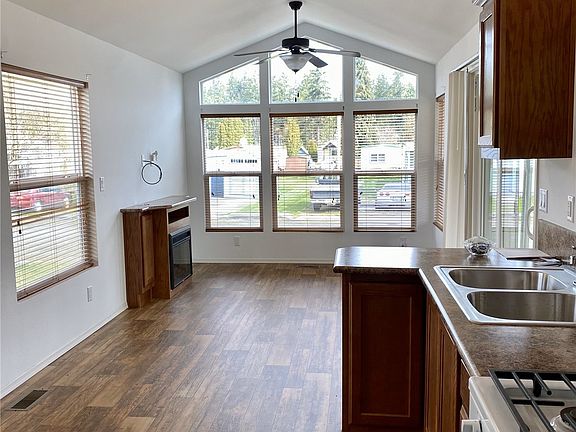 Lovely single wide home on leased land at Olympic Mobile Village near 4 Corners Rd. 1 bed/1bath, open, light and move-in ready. Did I mention AFFORDABLE???? Granite, nice grade laminate, an electric fireplace to cozy up to on the cooler nights. You will LOVE the huge covered porch! Altogether a great home for you. 55+ park and pets allowed with restrictions. Great location and the Park is making improvements consistently. Apartment size washer and dryer space and hook up installed!! DUCTLESS HEATING/COOLING BEING INSTALLED!!Don’t miss this great home!